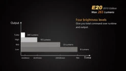 The new Fenix E20 2015 Edt. is a convenient and practical flashlight. It features a user-friendly interface with two easy-to-get AA batteries. This has a phenomenal maximum output of 265 lumens with a maximum beam distance of 689 feet (210 meters). There is a reserve tail switch for one-hand operation. Lots of similarities. The E20 – 2015 Edition is an excellent choice for outdoor activities as well as a spare light around the house.
