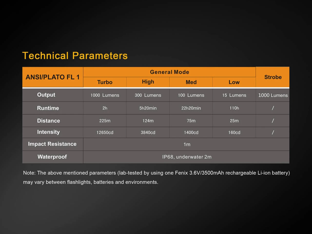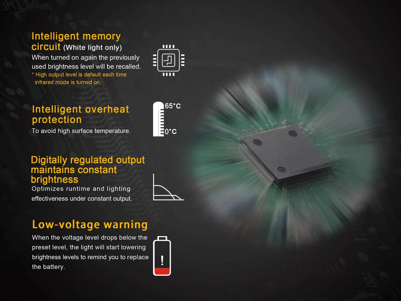 It is fitted with a CREE XP-G2 S3 white LED and 850nm infrared LED. The white light delivers a max output of 1000 lumens and a beam distance of 738.2 feet/225 meters, and the infrared delivers a max of 3000mW. The light is powered by one 18650 Li-ion battery, but is also compatible with cold-resistant CR123A batteries. The two tail switches are for output selection and strobe activation. This Fenix TK25IR version of the TK25 will be indispensable for hunting and most tactical demands.