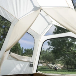 It is a hexa tarp that provides a wide shade at all times with a black pigment coating that boasts excellent light blocking power. It has sufficient waterproof and water repellent power with a water pressure of 5,000 mm. It is made in two colors, khaki and sand.
