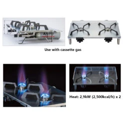 - Material: Main body: stainless steel | Trivet: iron | Stand/windshield (for back, both right and left): aluminum | Ignition switch/appliance plug knob: resin