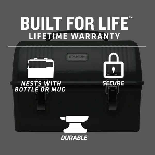 As far as vintage lunch boxes go, this one’s a real classic. Timeless design. Durable construction. And enough room to hold all your food (lunch, snack, second snack and more). There’s even a metal bracket just inside the lid that can keep your full-size Stanley Vacuum Bottle or Mug secure.